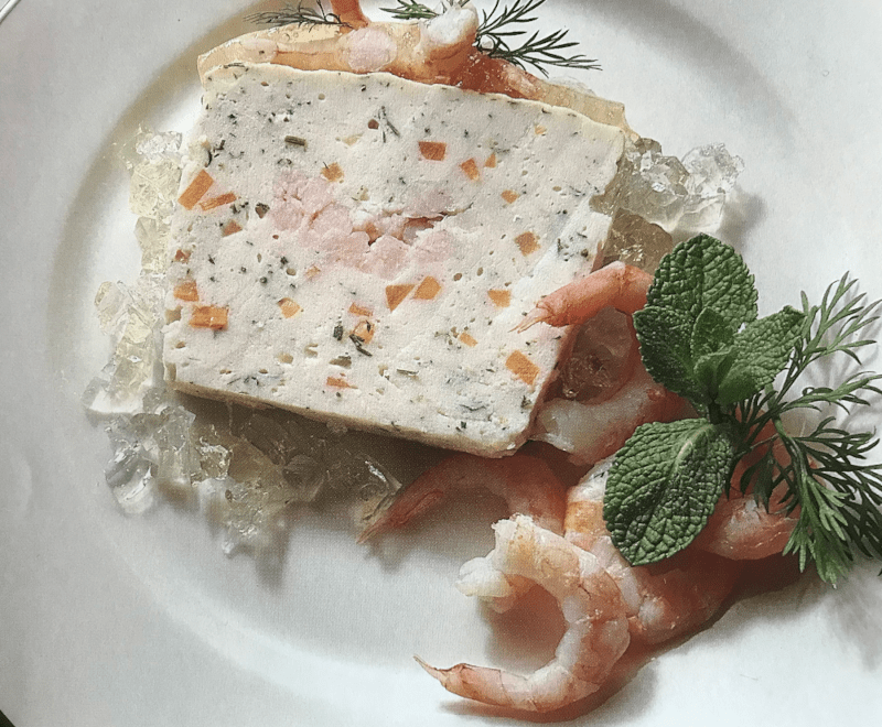 Heat the butter and gently fry the shallot until transparent, and let cool down. Mix the trout filets with salt, pepper and nutmeg and shallot and blend finely. Rest in the fridge for 20 minutes. Cut bread into small cubes, mix with half of the cream and put into the fridge. Mix verbena and prawns and chop. Whip the other half of the cream and beat egg whites until firm. Place fish farce on top of a bowl with ice cubes and add egg whites and bread mix. Mix until the farce starts to shine. Add whipped cream, spoon by spoon. Add carrots and prawns and transfer into the terrine dish. Close with a lid or double foil. Fill half of a deep baking tray with hot water (ca. 80 degrees), place the terrine dish into the middle and bake for 50 minutes. Let it cool down, decorate with prawns and verbena leaves.